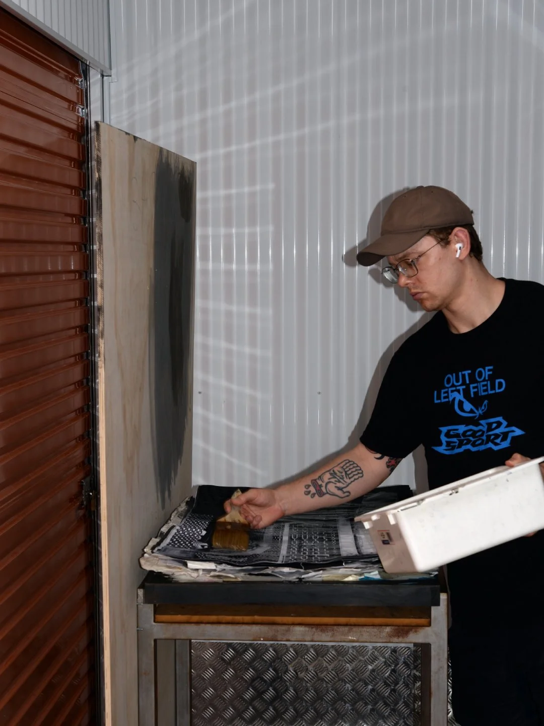 Jason laying rolling a fresh coat on the custom built structure for Remember?